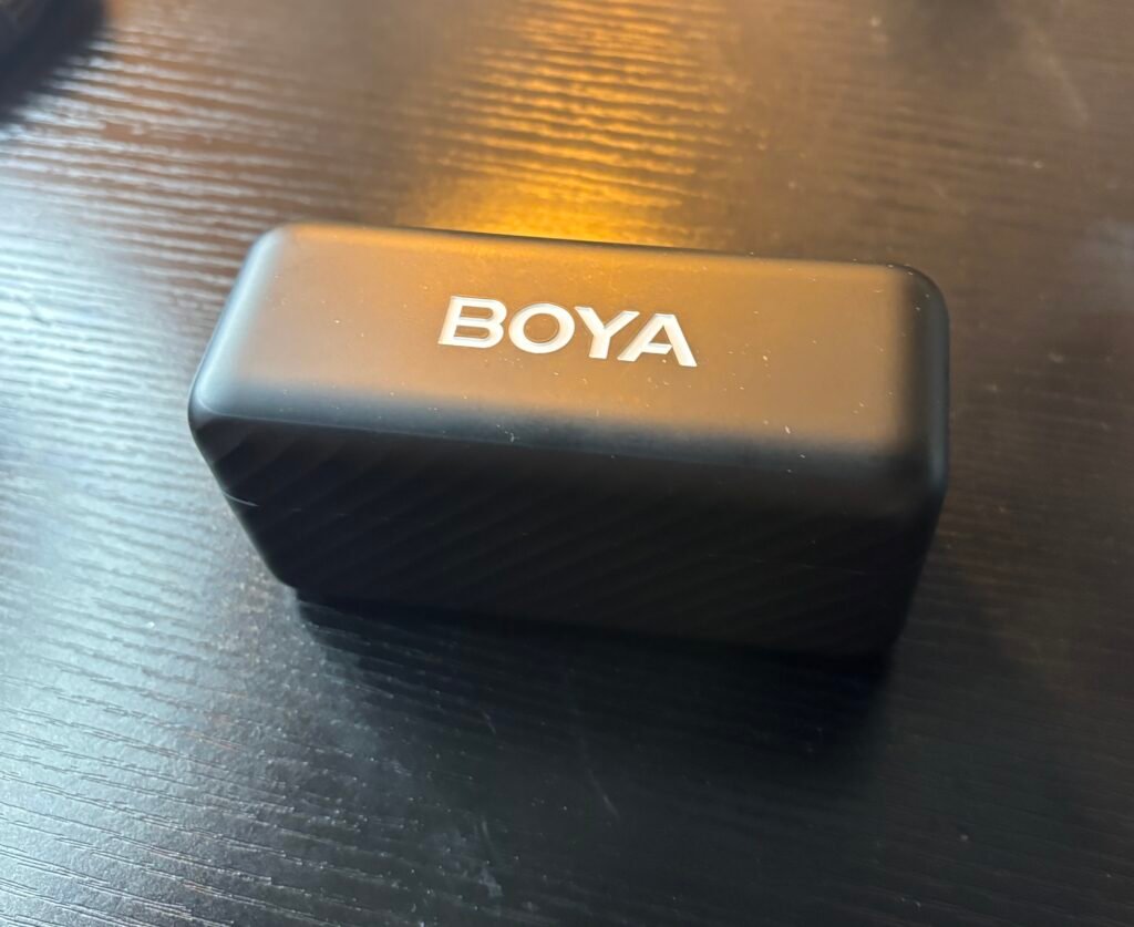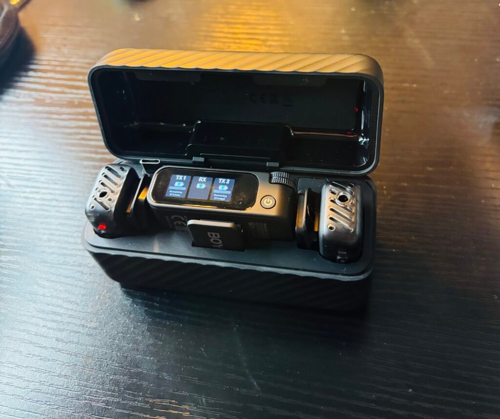 Boya resuelve todo eso. Inalámbrico — sin cables que estorben cuando te mueves. Doble transmisor — puedo grabar dos personas al mismo tiempo o tener un backup. Y el estuche de carga lo mantiene siempre listo sin preocuparme por la batería.